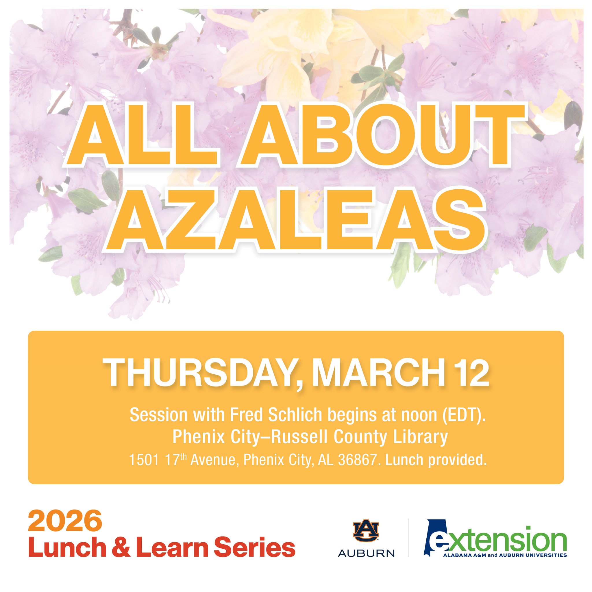 Today’s Lunch and Learn Series event presents “All About Azaleas”, with guest speaker Fred Schlich.