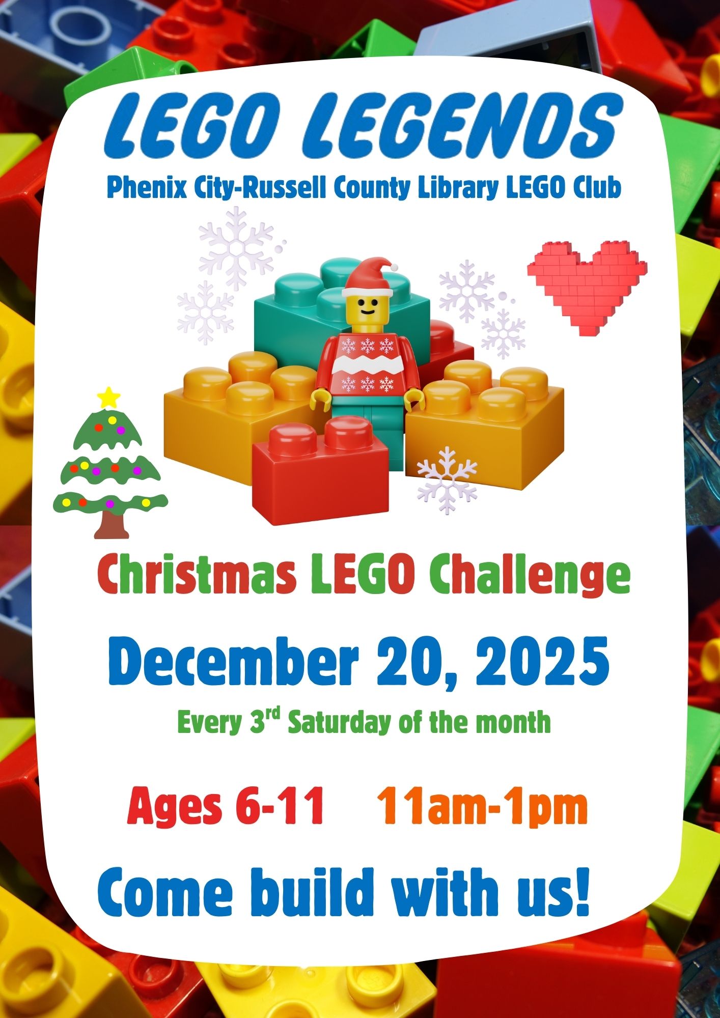 Phenix City - Russell County Library 1501 17th Avenue, Phenix City, AL, United StatesPlease join us November 15, 2025, as we host the Phenix City-Russell County Library LEGO Club "Lego Legends". Starting November 15, Lego Legends will begin meeting every third Saturday of the month in the
